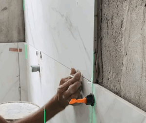 • Dùng hít đưa gạch lên vị trí cần ốp, căn chỉnh thật chuẩn vị trí đúng bằng máy lazer đã chuẩn bị trước đó.